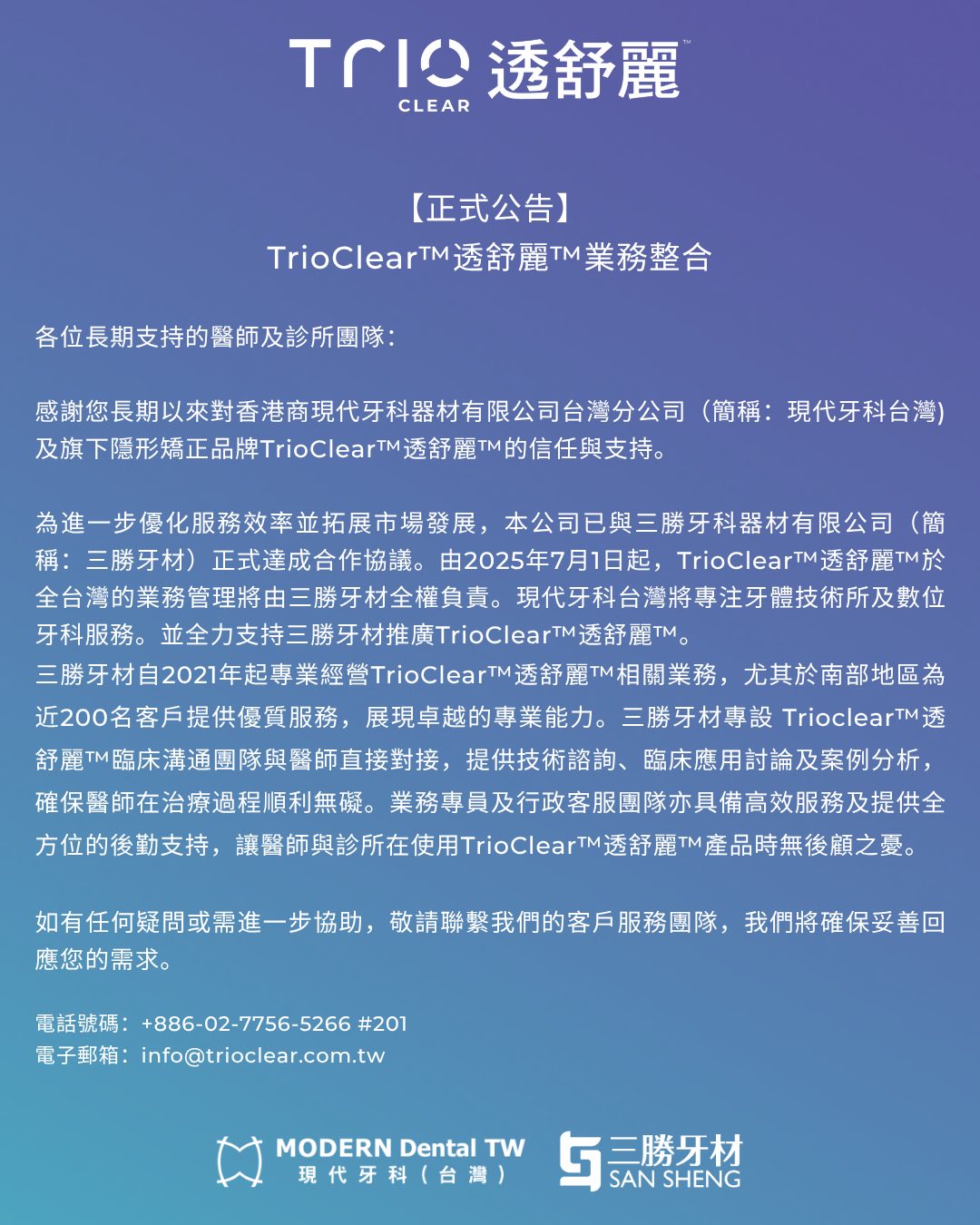 為進一步優化服務效率並拓展市場發展,本公司已與三勝牙科器材有限公司(簡稱:三勝牙材)正式達成合作協議。由2025年7月1日起,TrioClear™透舒麗™於全台灣的業務管理將由三勝牙材全權負責。現代牙科台灣將專注牙體技術所及數位牙科服務。並全力支持三勝牙材推廣TrioClear™透舒麗™。